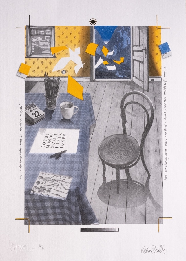 ‘The image is a personal reflection of what designing posters in the 1970s was like. Much of this happened on the kitchen table! Think of the image as a personal time capsule. I left the trim marks, registration marks, colour swatches and hastily written notes to the printer completely visible. That way the image serves as a memento of the pre-computer era. The Latin motto being prepared on the table means literally ‘All the world plays the actor’.’ – Kevin Scally, October 2024