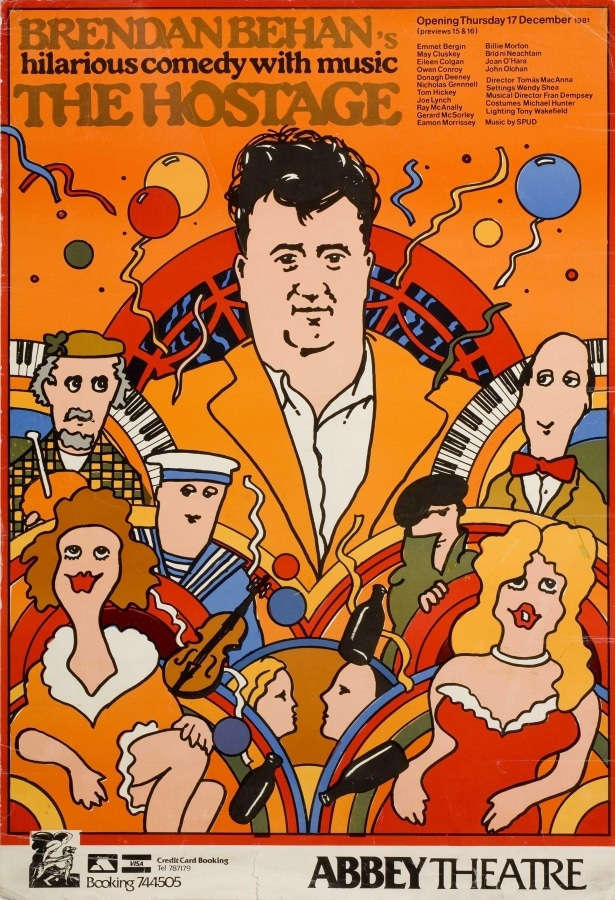 ‘Director Tomás MacAnna wanted to emphasise the play’s musicality and humour in the poster. I admired the Polish designer Waldemar Świerzy and drew on his style, featuring all the various characters from the play with Behan dominant, framed by an old Dublin fanlight.’ – Brendan Foreman, January 2025