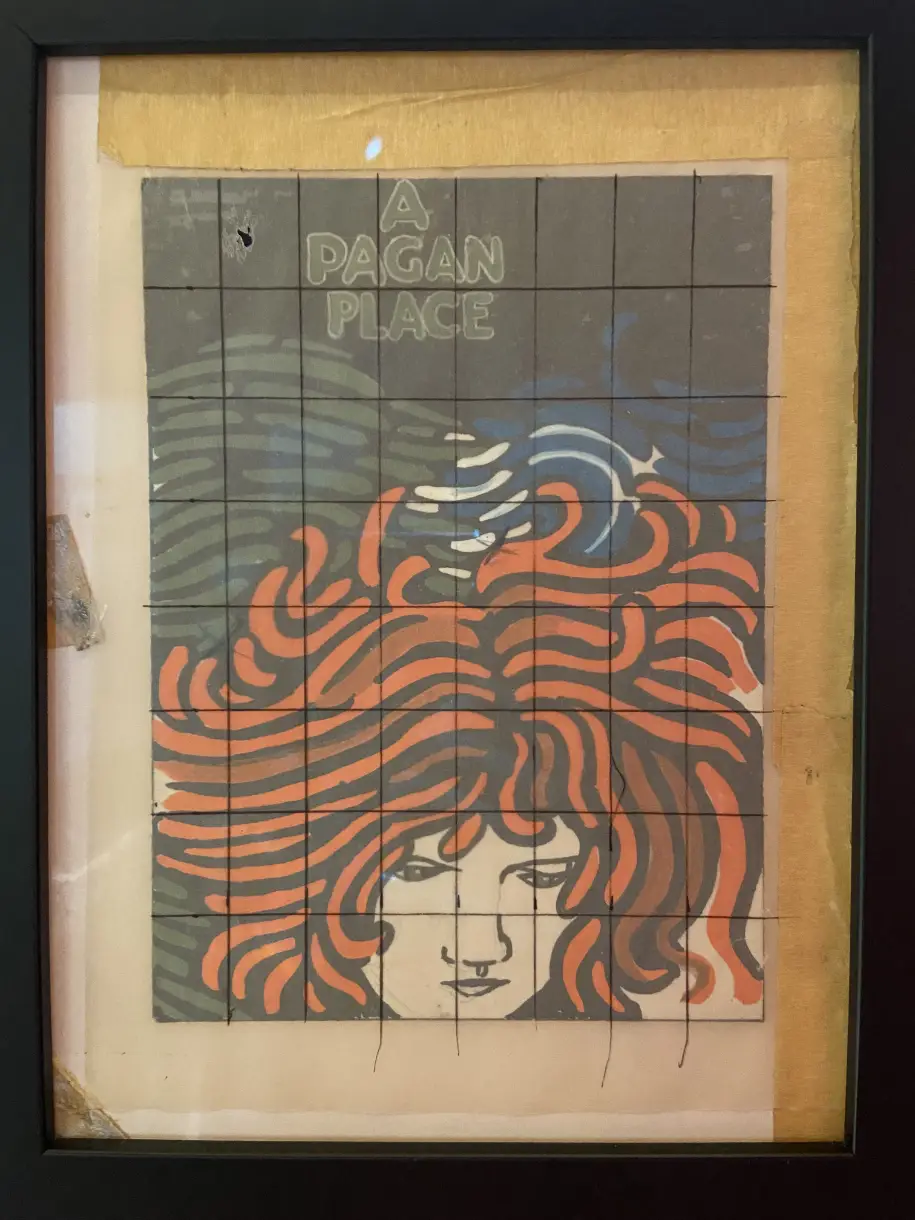 Each poster in this exhibition began as a rough sketch. Scally created this miniature gouache painting for A Pagan Place. He placed tracing paper over his sketch, onto which he drew a grid. This allowed him to scale up the original sketch to the much larger poster.