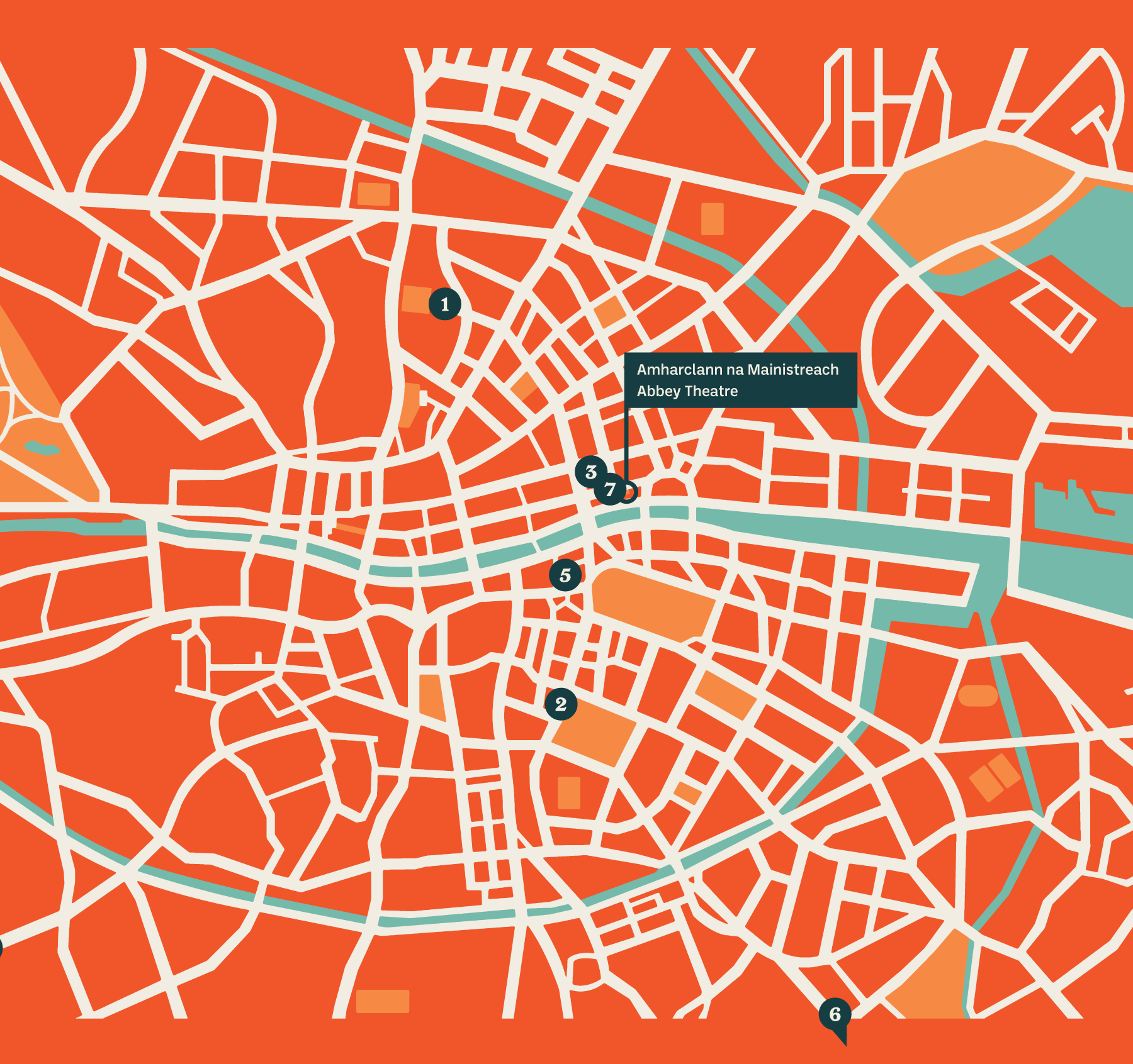 ‘I’ve chosen to feature the original Abbey logo: Elinor Mary Monsell’s woodcut commissioned by W.B. Yeats in 1904, depicting Queen Maeve hunting with her wolfhound on the hills of Ireland. I’ve always liked the individual, illustrative flair of Monsell’s work and strongly associate her logo with my time in the Abbey: for me it has as much evocative impact as an old photograph. I’ve dramatised the image with contrasting colours and a stylised, torn paper effect, suggesting the ephemeral life of a poster.’ – Brendan Foreman, October 2024