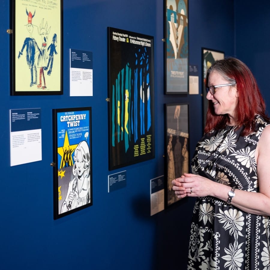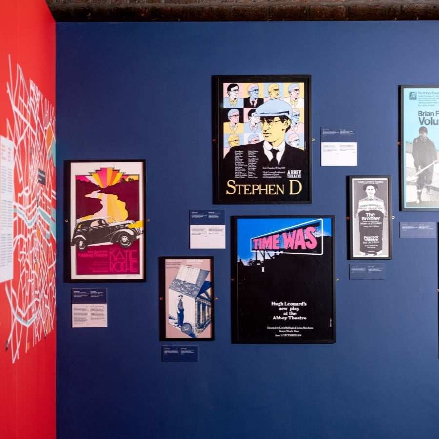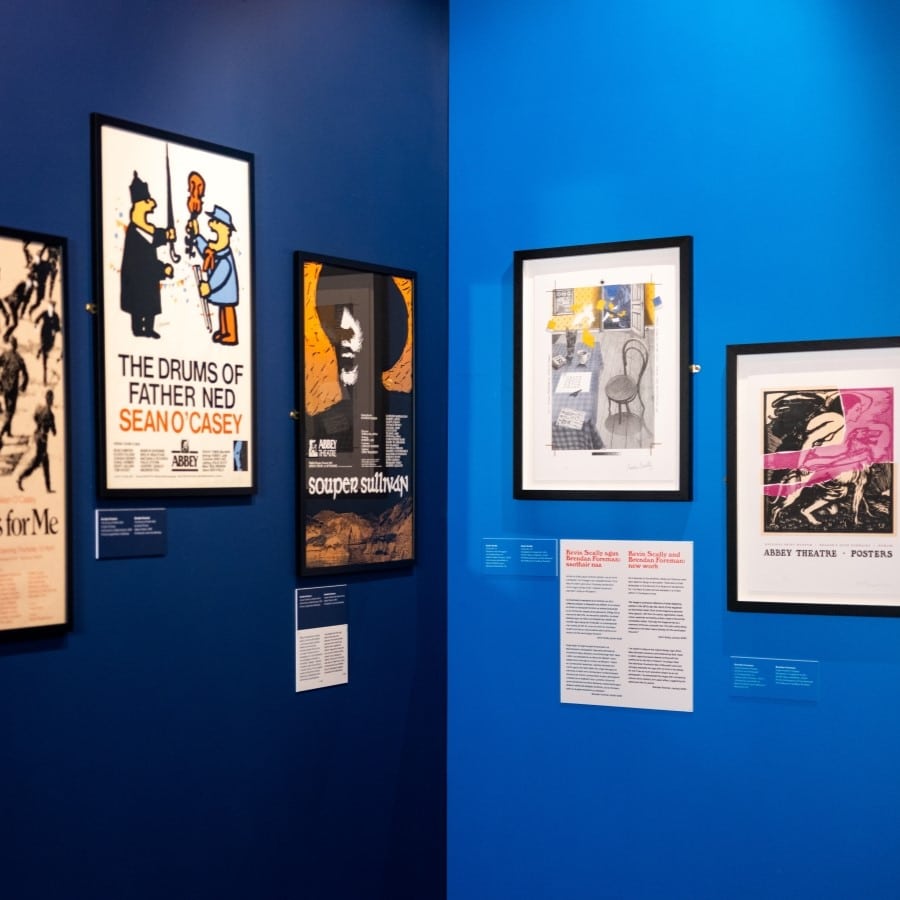Curatorial choices were carefully considered. The walls were painted deep blue to mirror the colour of the night sky (when a lot of theatre-going takes place). It also referenced the darkness of an auditorium, drawing attention to the posters as ‘pops’ of colour, like actors illuminated on a stage. The posters were not hung in a straight line, but were visually staggered to reference how they would have originally been viewed on Dublin streets.